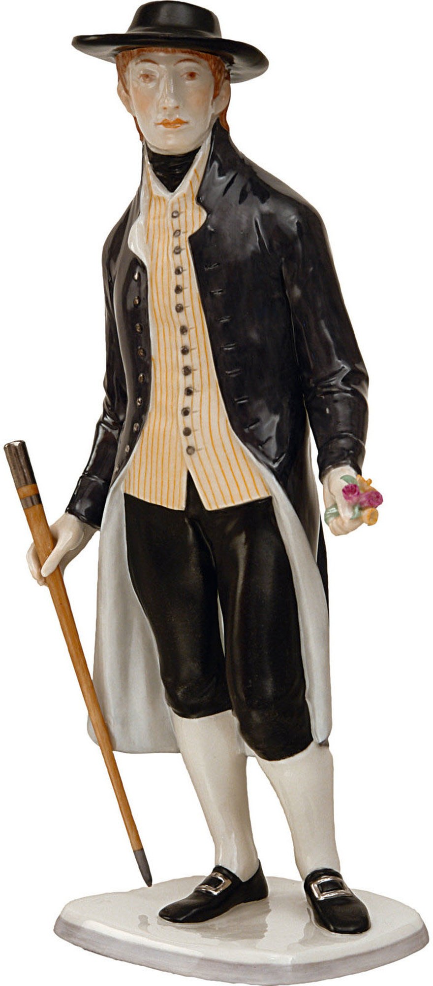 Admittedly, Munich lives up to its reputation as the city of singles. Yet whenever the Austrian artist Resl Schröder-Lechner designed figures for the Manufactory’s master workshops, neither man nor woman could remain alone. Until her death in 2000, Schröder-Lechner always presented her smart figures from the Traditional Dress group in pairs. The design of the outfits was often preceded by in-depth research into historical dress. And this well-dressed Munich Man in frock coat and waistcoat is no exception. The figure, designed in 1986, is wearing the elegant dress of a gentleman burgher.